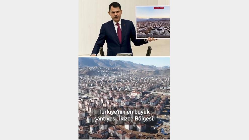 Malatya - Çevre, Şehircilik ve İklim Değişikliği Bakanı Murat Kurum, TBMM Genel Kurulu'nda bakanlığına ait bütçe görüşmeleri esnasında Malatya'da deprem sürecinde yapılan çalışmaları anlatırken, Türkiye'nin en büyük şantiyesinin 27 bin konut ile Malatya'da bulunduğunu belirtti.