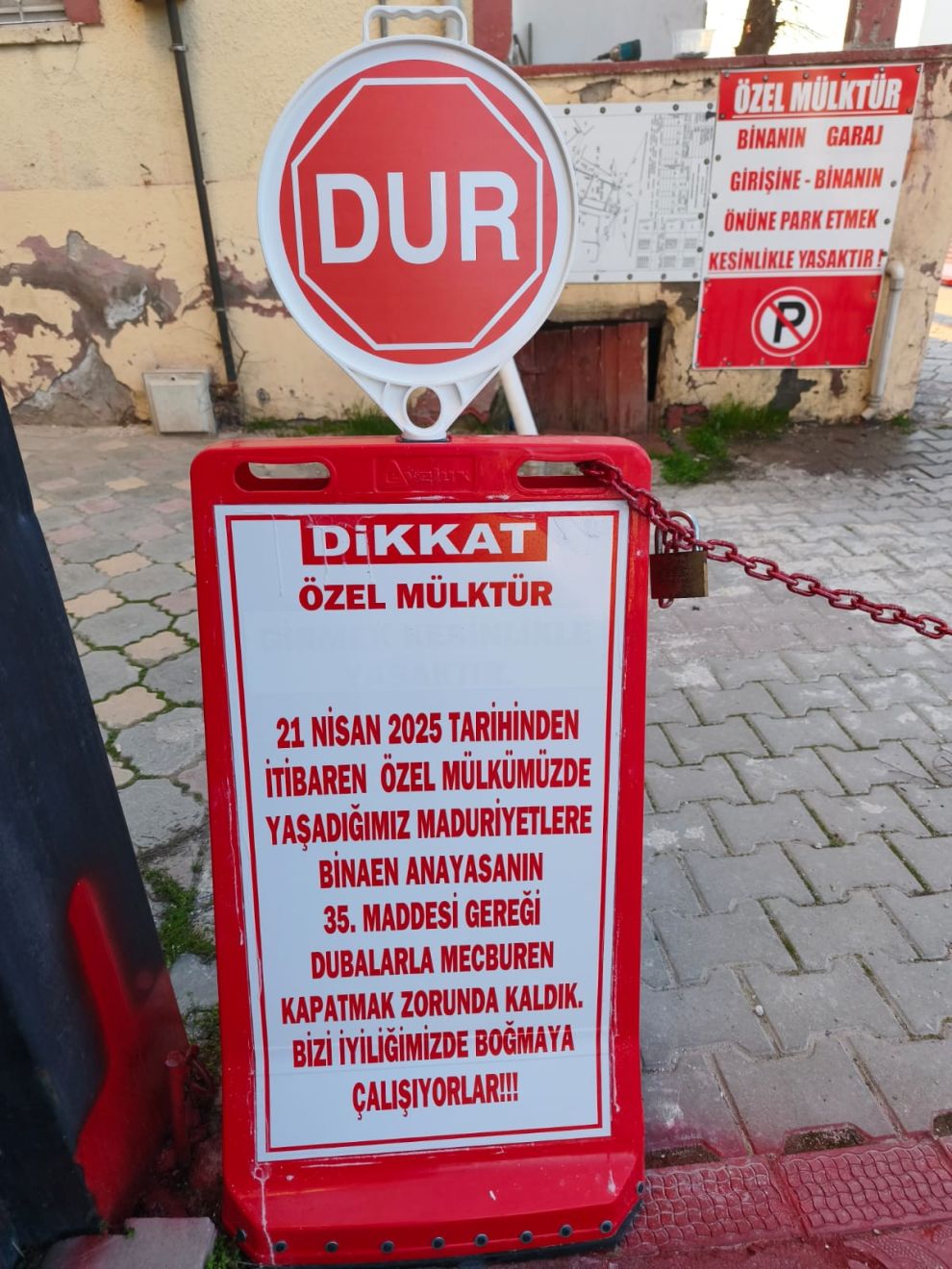 İkinci levhada ise şu ifadeler kullanıldı: “DİKKAT ÖZEL MÜLKTÜR. 21 NİSAN 2025 TARİHİNDEN İTİBAREN ÖZEL MÜLKÜMÜZDE YAŞADIĞIMIZ MAĞDURİYETLERE BİNAEN ANAYASANIN 35. MADDESİ GEREĞİ DUBALARLA MECBUREN KAPATMAK ZORUNDA KALDIK. BİZİ İYİLİĞİMİZDE BOĞMAYA ÇALIŞIYORLAR!!!”