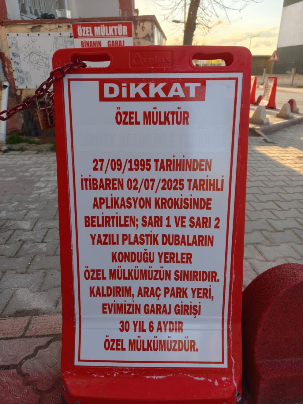Levhalardan birinde şu ifadeler yer aldı: “DİKKAT. ÖZEL MÜLKTÜR. 27/09/1995 TARİHİNDEN İTİBAREN 02/07/2025 TARİHLİ APLİKASYON KROKİSİNDE BELİRTİLEN; SARI 1 VE SARI 2 YAZILI PLASTİK DUBALARIN KONDUĞU YERLER ÖZEL MÜLKÜMÜZÜN SINIRIDIR. KALDIRIM, ARAÇ PARK YERİ, EVİMİZİN GARAJ GİRİŞİ 30 YIL 6 AYDIR ÖZEL MÜLKÜMÜZDÜR.”
